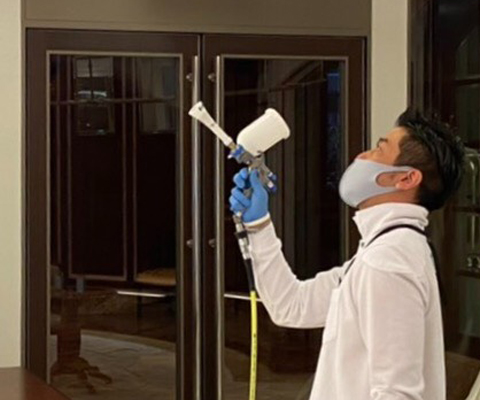 ●吹き付け量の目安は、畳一畳(天井高2.5m程度)あたり40~80mL程度です。日にちをあけて乾燥させながら、複数回にわけて吹き付けると、より効果的です。
